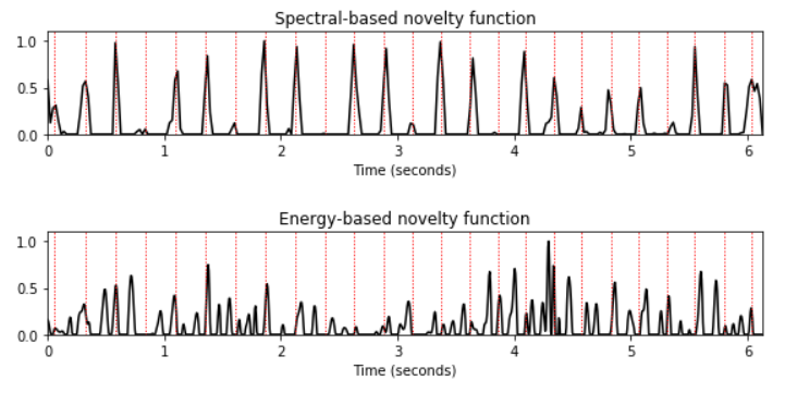 음악의 온셋(onset)을 설명하고, 온셋을 감지하기 위해 변화를 포착하는 노벨티(novelty) 함수의 네 가지 종류를 설명하고 비교한다. 또한 피크-선택(peak-picking) 방법을 알아본다.