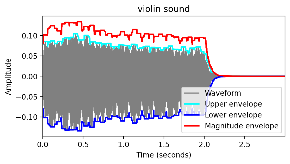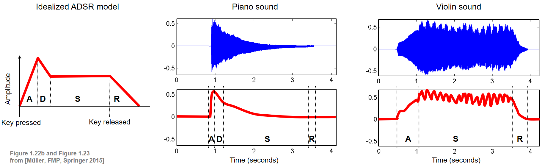 - 톤의 에너지의 대부분은 낮은 부분에 포함되어 있고, 높은 부분에 대한 에너지는 낮은 경향이 있다. 이러한 분포는 많은 악기에서 일반적이다. 현악기의 경우, 소리는 풍부한 부분 스펙트럼을 갖는 경향이 있는데, 여기서 많은 에너지가 상부 고조파(harmonics)에도 포함될 수 있다. 이 그림은 또한 트레몰로(특히 플루트의 경우)와 비브라토(특히 바이올린의 경우)를 보여준다.