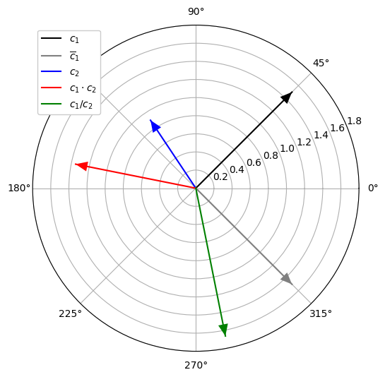 - 기하학적으로, 이 곱은 각도를 더하고 절대값을 곱함으로써 얻어진다. 다시 말해, \((|c_1|, \gamma_1)\)와 \((|c_2|, \gamma_2)\)가 각각 \(c_1\)와 \(c_1\)의 극좌표 표현이라면, \(c\)의 극좌표 표현 \((|c|, \gamma)\)는 다음과 같이 주어진다.