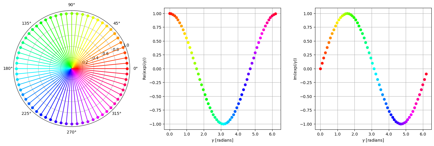 특히, 복소수 값 \(\mathrm{exp}(i\gamma)\)은 모든 \(\gamma\in\mathbb{R}\)에 대해 복소수 평면의 단위 원(unit circle)에 있다. 또한 주기성(periodicity)으로 인해 \(\gamma\in[0,2\pi)\)을 고려하기에 충분하다.