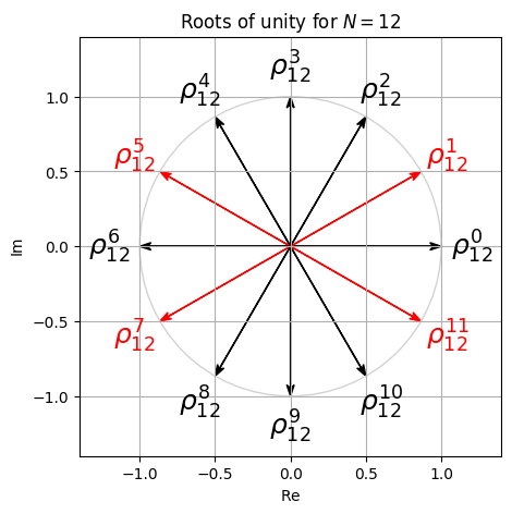 \(N \in \mathbb{N}_{>0}\)를 양의 정수라고 하자. 복소수 \(\rho \in \mathbb{C}\)는 \(\rho^N = 1\)인 경우 \(N^\mathrm{th}\) 1의 거듭제곱근(root of unity)라고 한다. 다시말해 1의 거듭제곱근은 거듭제곱하여 1이 되는 복소수이다. 정확히 \(N\)개의 뚜렷한 \(N^\mathrm{th}\) root of unity가 있다는 것을 보이는 것은 어렵지 않다.