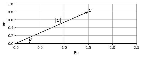 - 복소수 \(c=a+ib\)는 \((|c|, \gamma)\) 쌍에 의해 고유하게 정의되며, 이는 \(c\)의 극좌표 표현(polar representation)이라고도 한다. 다음과 같이 극좌표 표현 \((|c|,\gamma)\)에서 데카르트 표현(Cartesian representation) \((a,b)\)를 얻는다.