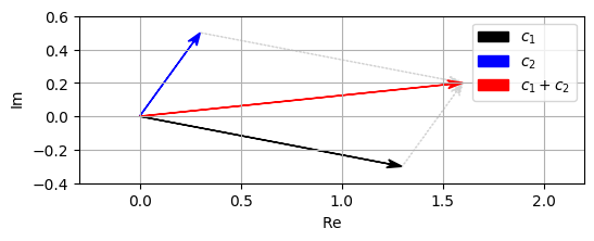 - 두 복소수 \(c_1=a_1+ib_1\)와 \(c_2=a_2+ib_2\)의 경우, 합은 다음과 같다.