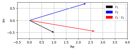 \[c = c_1 \cdot c_2 = (a_1 + ib_1) \cdot (a_2 + ib_2) := (a_1a_2 - b_1b_2) + i(a_1b_2 + b_1a_2).\]