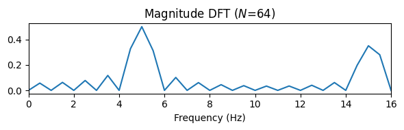 즉, 이산 푸리에 변환은 \(\mathrm{DFT}_N\)의 크기 \(N\)에 따라 달라지는, 해상도 \(F_\mathrm{s}/N\)의 선형 주파수 그리드(frequency grid)를 얻는다.