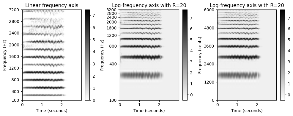 librosa함수librosa.stft는 두 개의 파라미터n_fft(\(L\)에 해당) 및win_length(\(N\)에 해당)를 통해 이 아이디어를 구현한다. 파라미터를 물리적 도메인으로 변환할 때 주의해야 한다.바이올린이 연주하는 음 C4의 예를 보자