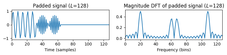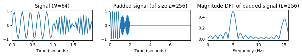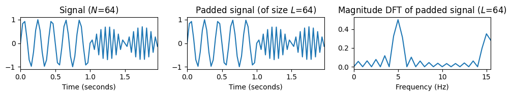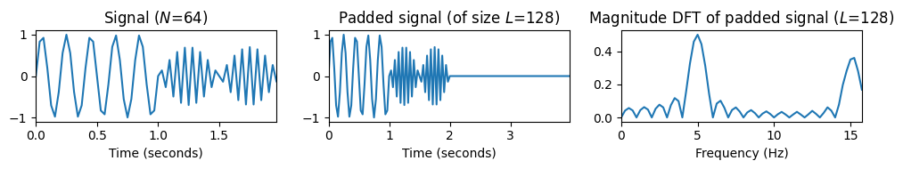 이를 위해 \(L\in\mathbb{N}\) with \(L\geq N\)라고 하자. 그런 다음 \(\tilde{x}\in \mathbb{R}^L\) 신호를 얻기 위해 \(x\) 신호 오른쪽에 제로 패딩(zero padding)을 적용한다.