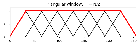 plot_sum_window(w, H, L, title='Triangular window, H = N/2');