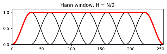 plot_sum_window(w, H, L, title='Hann window, H = N/2');