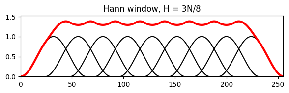 plot_sum_window(w, H, L, title='Hann window, H = 3N/8');