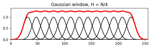 plot_sum_window(w, H, L, title='Gaussian window, H = N/4');