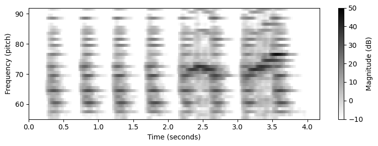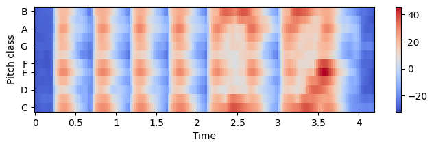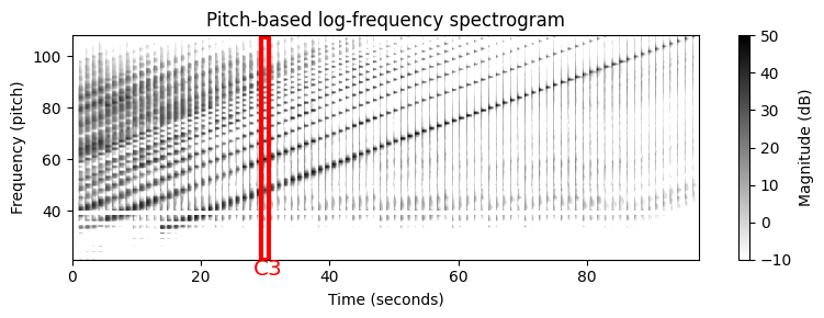 이러한 특징(feature)은 선형 주파수 축(Hertz로 측정)을 로그(log) 축(피치로 측정)으로 변환하여 스펙트로그램에서 얻을 수 있다. 이 결과를 로그 주파수 스펙트로그램(log-frequency spectrogram) 이라고도 한다.