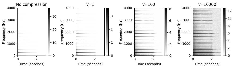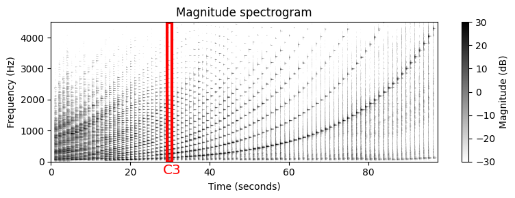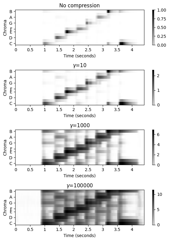 예를 들어 피아노 연주 반음계(chromatic scale)를 고려해보자. 결과의 스펙트로그램은 연주된 음의 피치에 대한 기본 주파수(fundamental frequency)의 기하급수적 종속성(exponential dependency)을 나타낸다. 또한 화음과 음의 온셋(onset) 위치(수직 구조)가 명확하게 표시된다.
