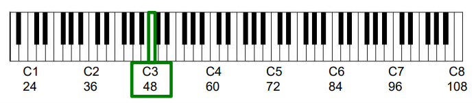 다음 표는 다양한 음표와 MIDI 음표 번호 \(p\), 중심 주파수 \(F_\mathrm{pitch}(p)\), 컷오프(cutoff) 주파수 \(F_\mathrm{pitch}(p-0.5)\) 및 \(F_\mathrm{pitch}(p+0.5)\) 및 대역폭 \(\mathrm{BW}(p)\)을 보여준다.