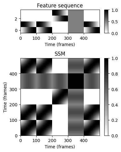 다음 예에서는 정규화된(normalized) 특징 벡터의 합성(synthetic) 특징 시퀀스를 생성한다. 특징 벡터의 차원은 \(K=4\)이고 시퀀스의 길이는 \(N=500\)이다. 그림은 특징 시퀀스와 결과 SSM을 보여준다.