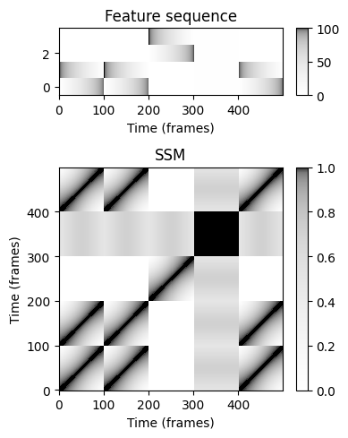 - 위에서 설명한 정규화된 특징의 특징 시퀀스와 유사도 측정을 사용하면 간단한 행렬-행렬 곱으로 SSM을 계산할 수 있다. 보다 정확하게는 \(K\times N\)-matrix \(X\)에 의해 특성 시퀀스가 구현되는 경우, SSM \(S\)는 \(S=X^\top X\)로 주어진다.