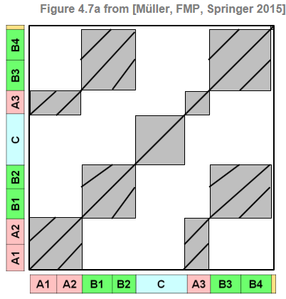 예로, 다음 그림은 음악적 구조가 \(A_1A_2B_1B_2CA_3B_3B_4D\)인 Brahms의 헝가리 무곡 5번에 대한 이상적인 SSM을 보여준다. 세 개의 반복되는 \(A\) 부분 세그먼트가 동종이라고 가정하면 SSM에는 \(A_1A_2\)에 해당하는 세그먼트를 자신과 관련시키는 2차 블록과 \(A_3\) 부분 세그먼트를 자신과 관련시키는 또 다른 2차 블록이 있다. 또한 두 개의 직사각형 블록이 있는데, 하나는 \(A_1A_2\) 부분 세그먼트를 \(A_3\) 부분 세그먼트에 연결하고 다른 하나는 \(A_3\) 부분 세그먼트를 \(A_1A_2\) 부분 세그먼트에 연결한다. 3개의 반복되는 \(A\) 부분 세그먼트가 동질적이지 않은 경우 SSM은 주 대각선에 평행하게 실행되는 경로 구조를 나타낸다. 예를 들어 \(A_1\)와 \(A_2\)의 유사도가 큰 경로와 \(A_1\)와 \(A_3\)의 경로가 있다.