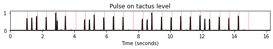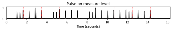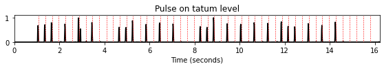 - 다음 코드 셀에서는 스펙트럼 기반 노벨티 함수 위에 표시되는 다양한 펄스 수준에 대해 수동으로 주석이 달린 펄스 위치를 시각화한다. 또한 원본 음악 녹음과 겹쳐진 펄스 위치의 sonification를 들을 수 있다.