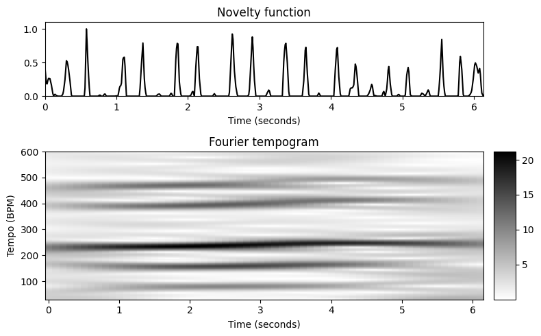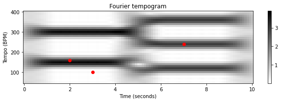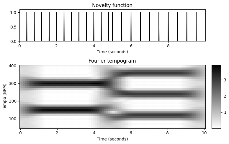 이제 주어진 음악 녹음에 대한 특정 템포의 로컬 관련성을 각 시간 인스턴스에 대해 나타내는 템포그램(tempogram) 이라는 유사한 개념을 소개한다. 수학적으로, 템포그램을 다음과 같은 함수로 모델링한다. \[\mathcal{T}:\mathbb{R}\times \mathbb{R}_{>0}\to \mathbb{R}_{\geq 0}\] 초 단위의 시간 매개변수 \(t\in\mathbb{R}\)와 분 당 비트(beats per minute = BPM)단위의 템포 매개변수로 측정