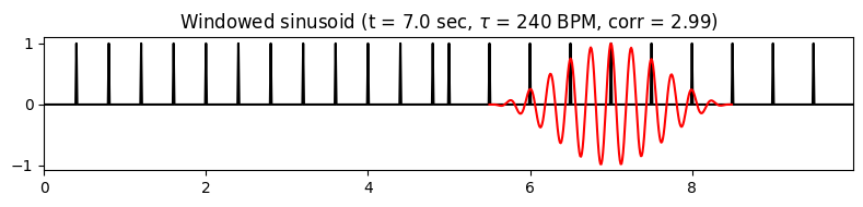 템포그램을 얻기 위해 주어진 시간 인스턴스 근처에서 다양한 기간 \(T>0\)(초 단위)에 대한 주기적인 행동을 정량화한다. 속도 \(\omega=1/T\)(\(\mathrm{Hz}\)로 측정)와 템포 \(\tau\)(\(\mathrm{BPM}\)로 측정)는 다음과 같이 연관된다: \(\tau = 60 \cdot \omega\)