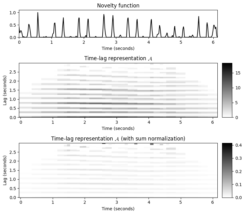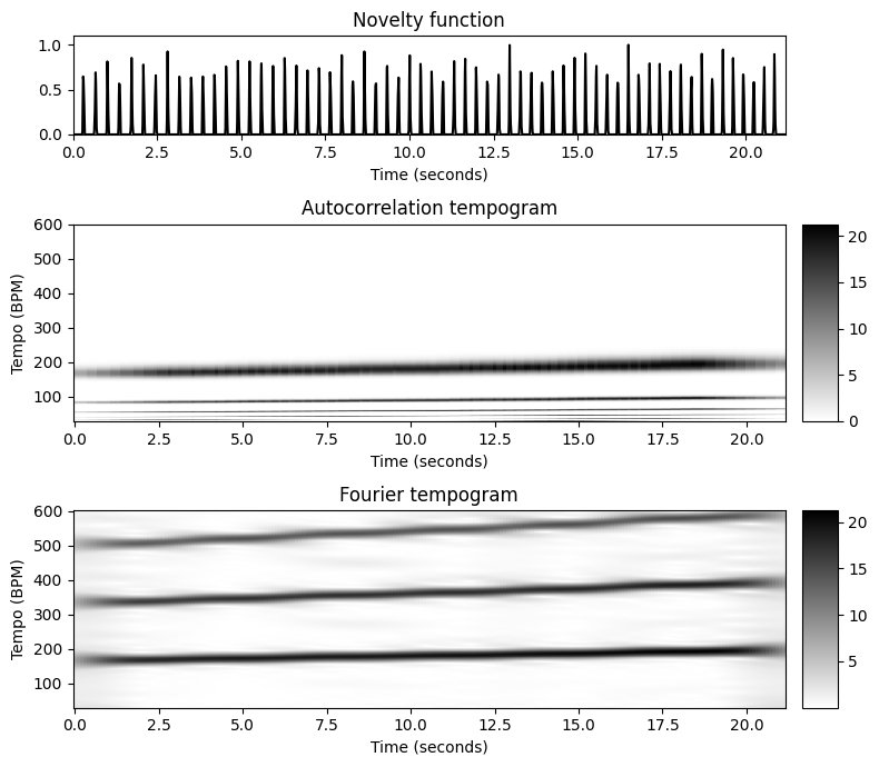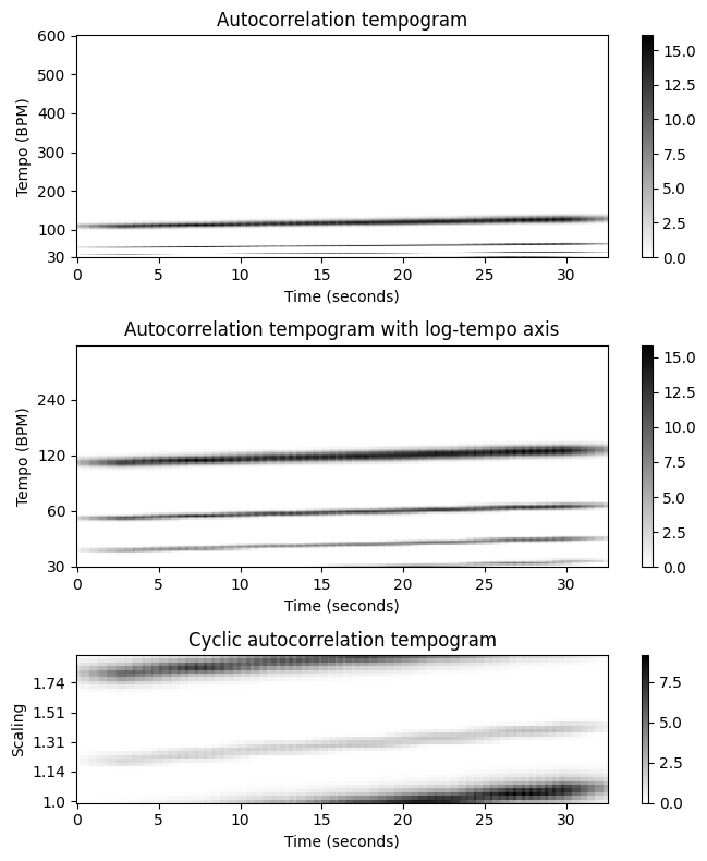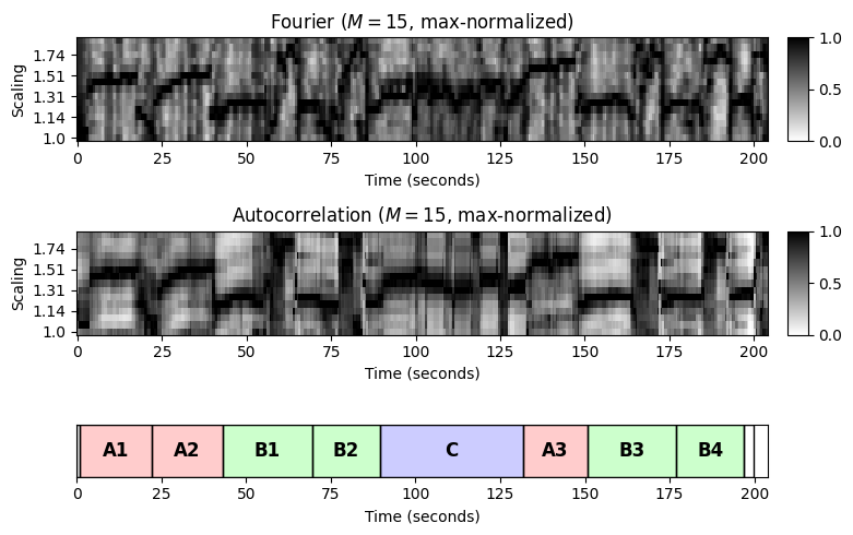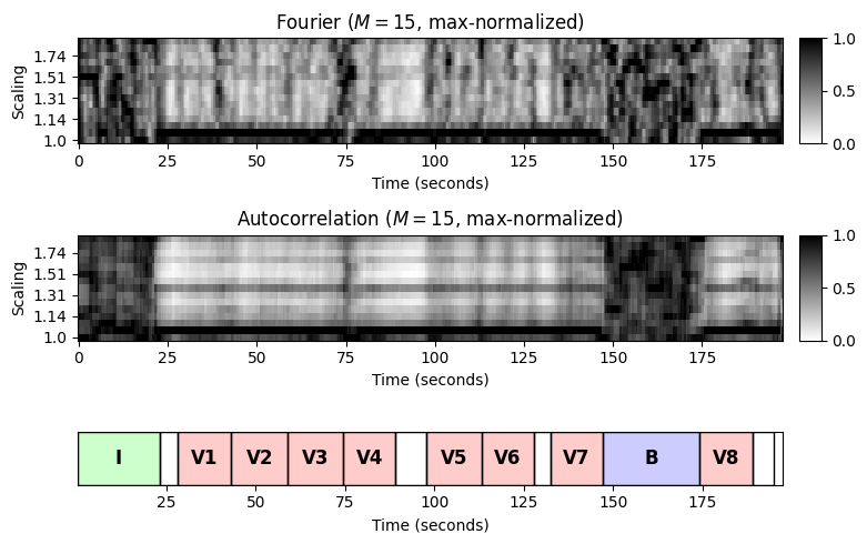 다음 그림에서는 순환 자기상관과 푸리에 템포그램 표현을 보여준다. 이러한 표현은 정확한 템포를 나타내지는 않지만 동질성 기반 구조 분석에 유용할 수 있는 템포 관련 정보를 캡처한다.
