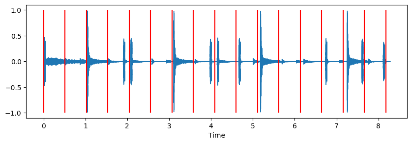 plt.vlines(beat_times, -1, 1, color='r')<matplotlib.collections.LineCollection at 0x238d5a76670>