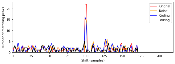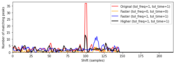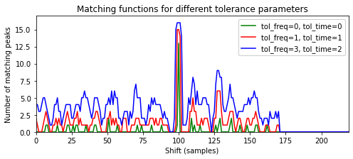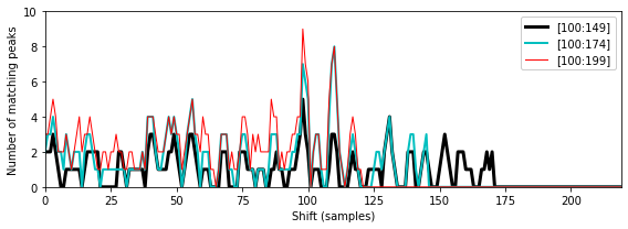 xlabel='Shift (samples)', ylabel='Number of matching peaks',