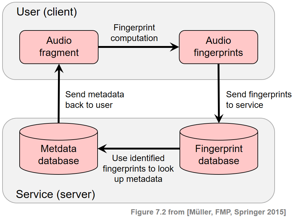 • 최근 음악 검색 서비스는 오디오 녹음을 식별하고 적절한 콘텐츠 정보를 제공함으로써 이러한 상황에서 사용자를 돕는다. 일반적인 시나리오는 클라이언트(client)라고도 하는 사용자가 스마트폰을 사용하여 알려지지 않은 노래의 짧은 오디오 조각을 녹음하는 것이다. 그런 다음 오디오 조각은 압축되고 설명적인 오디오 특징인 소위 오디오 지문(fingerprints) 으로 변환된다.