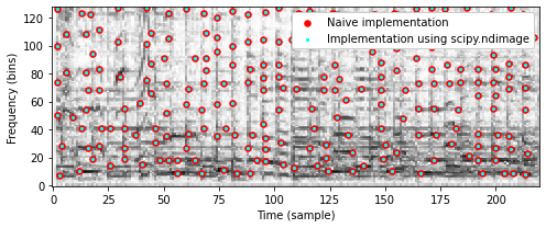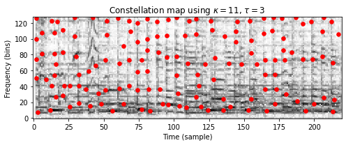 • 이를 위해 각 지점 주변의 영역 내 모든 이웃보다 더 큰 크기를 갖는 시간-주파수 지점을 식별하는 피크 선택 전략을 사용한다. 보다 정확하게는 \(\tau\in\mathbb{N}\)\(\kappa\in\mathbb{N}\)를 각각 시간 및 주파수 방향에서 이웃의 크기를 결정하는 매개변수라고 한다. 그런 다음 다음과 같은 경우 점 \((n_0,k_0)\)이 피크로 선택된다. \[|X(n_0,k_0)| \geq |X(n,k)|\] for all \((n,k) \in \big(\left[n_0-\tau:n_0+\tau\right] \times \left[k_0-\kappa:k_0+\kappa\right]\big)\).