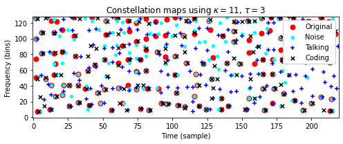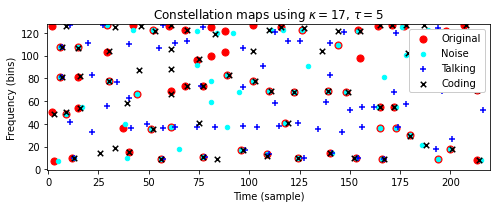 • 피크 선택 단계는 신호의 복잡한 스펙트로그램 표현을 희소한 좌표 세트로 줄인다. 피크의 크기는 더 이상 사용되지 않으며 피크의 시간 및 주파수 스탬프만 고려되어 높은 수준의 견고성을 제공한다. 모든 피크 좌표로 구성된 표현을 constellation map이라고 한다.