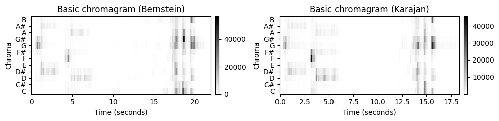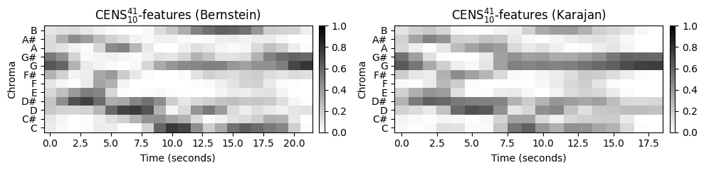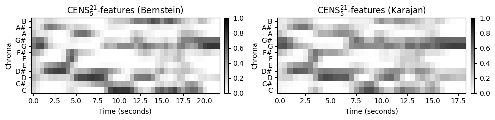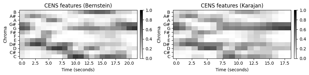- 코드 셀에서 \(10\mathrm{Hz}\)의 피쳐 레이트(feature rate)를 사용하여 Bernstein 및 Karajan 녹음에 대한 기본 크로마 변형을 생성한다. 여기서 각 크로마 벡터는 절반 크기의 윈도우 겹침이 있는 \(200~\mathrm{msec}\)의 윈도우에 해당한다.