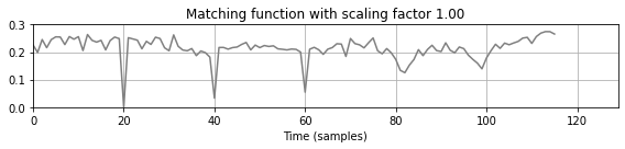조옮김 불변 매칭 함수(transposition-invariant matching function) \(\Delta^\mathrm{TI}\)는 다음을 설정하여 얻는다. \[\Delta^\mathrm{TI}(m):= \min_{i\in [0:11]} \Delta^{i}(m)\] for \(m\in[0:M-1]\).