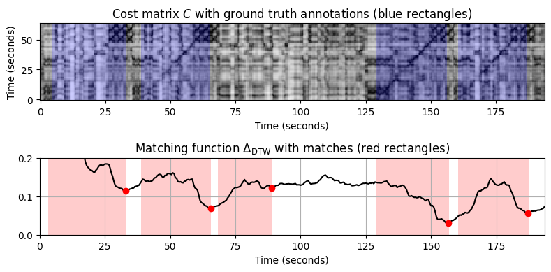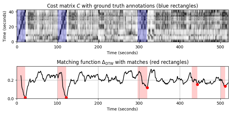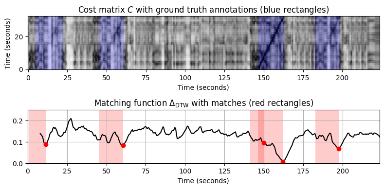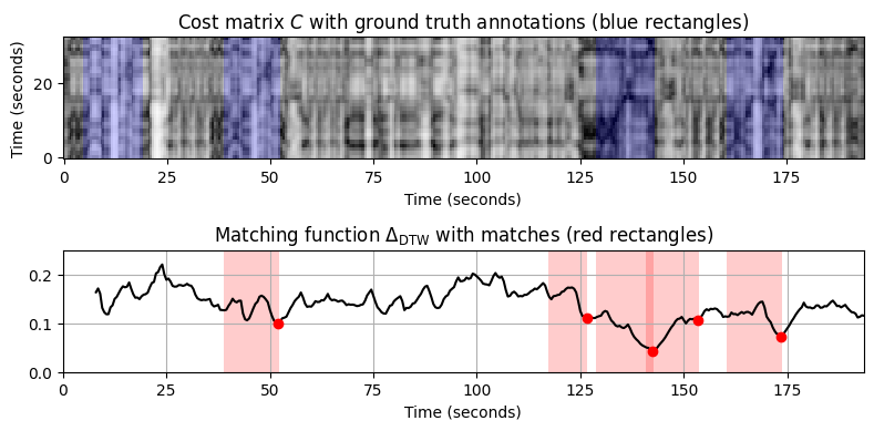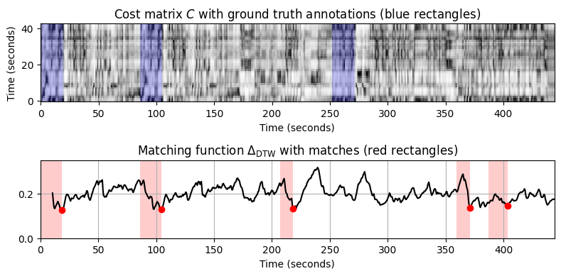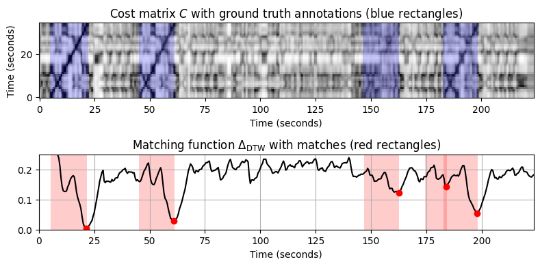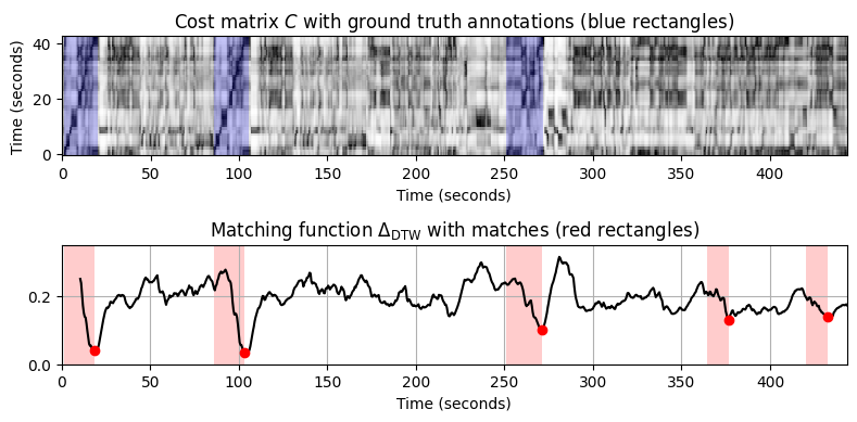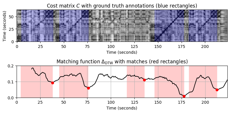 compute_plot_matching_function_DTW(path_data+fn_wav_X, path_data+fn_wav_all[f], path_data+fn_ann_all[f])=== Query X: Bernstein (Theme 1); Database Y: Bernstein ===