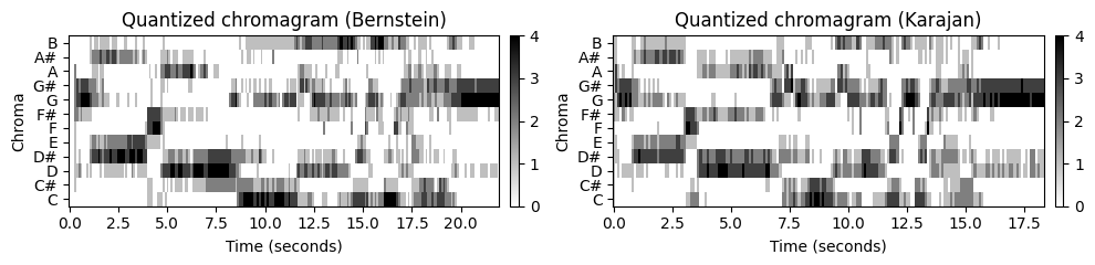 plot_two_chromagrams(C1_Q, C2_Q, Fs1=Fs1, Fs2=Fs2, title1=title1, title2=title2, clim=[0, 4])